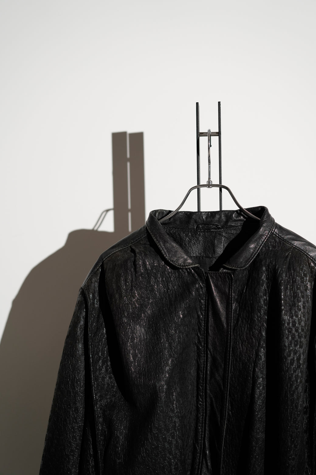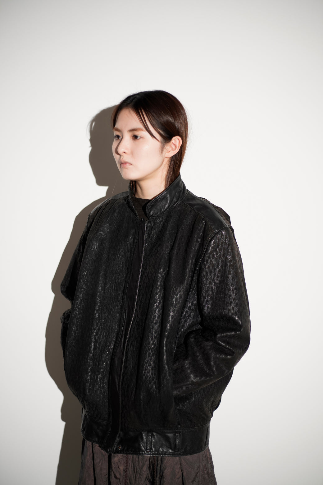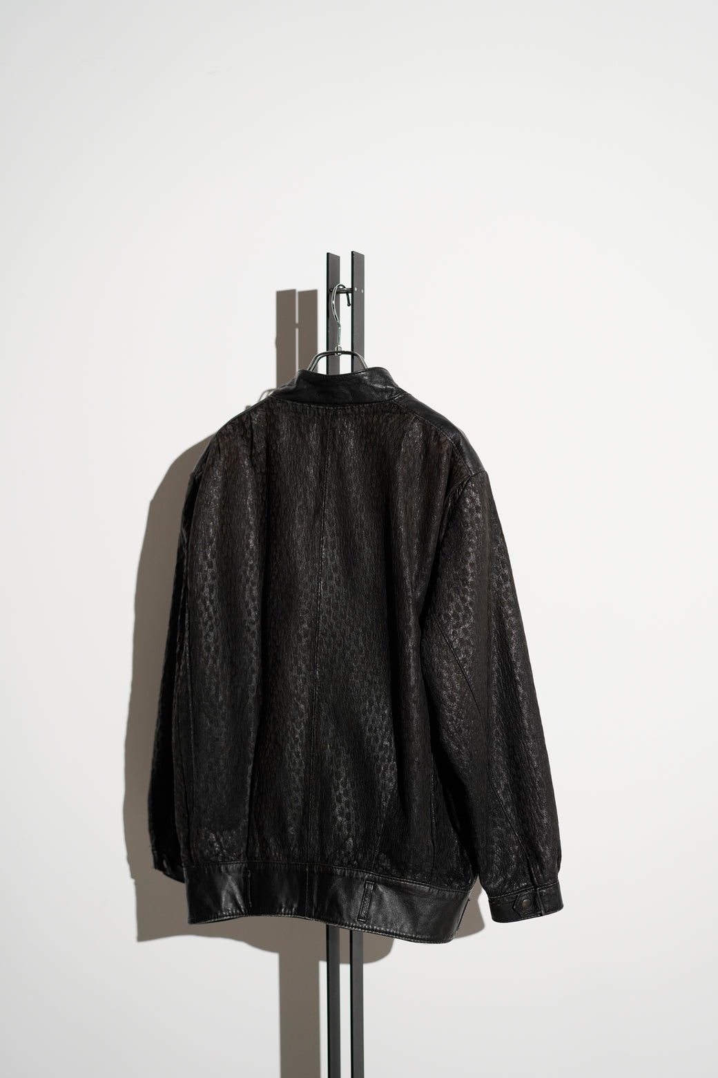 シボ感の強いレザーを使用したスタンドカラージャケット。フロントは比翼仕様で、ミニマルな構成。裾はややボックス寄りのシルエットで、身幅にゆとりがあります。襟はやや高さのある設計で、立ち上げても寝かせても着用可能。袖・裾まわりは切り替えが入り、レザー特有の重みと落ち感があります。経年による適切な風合いを伴った良好なコンディション。