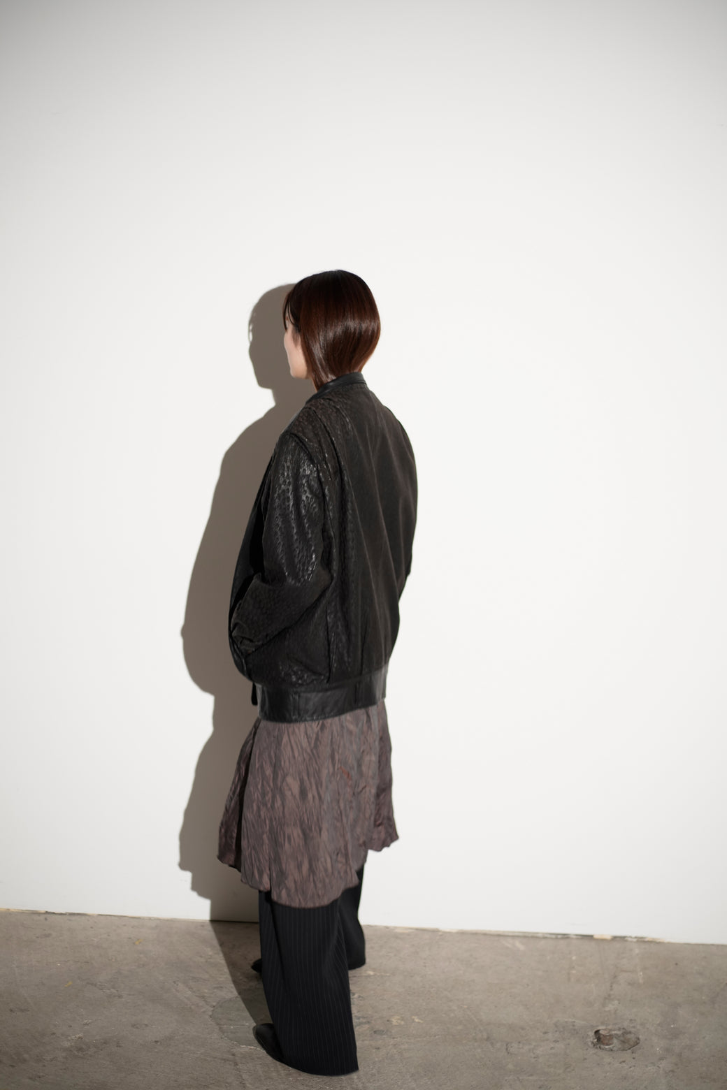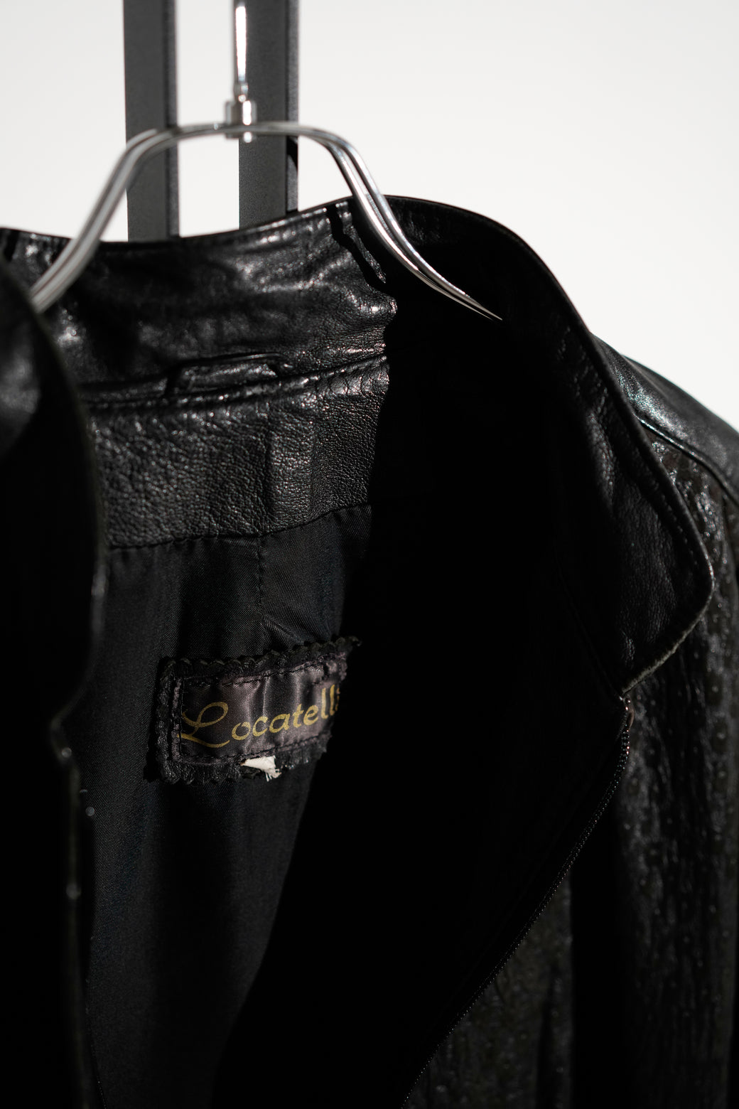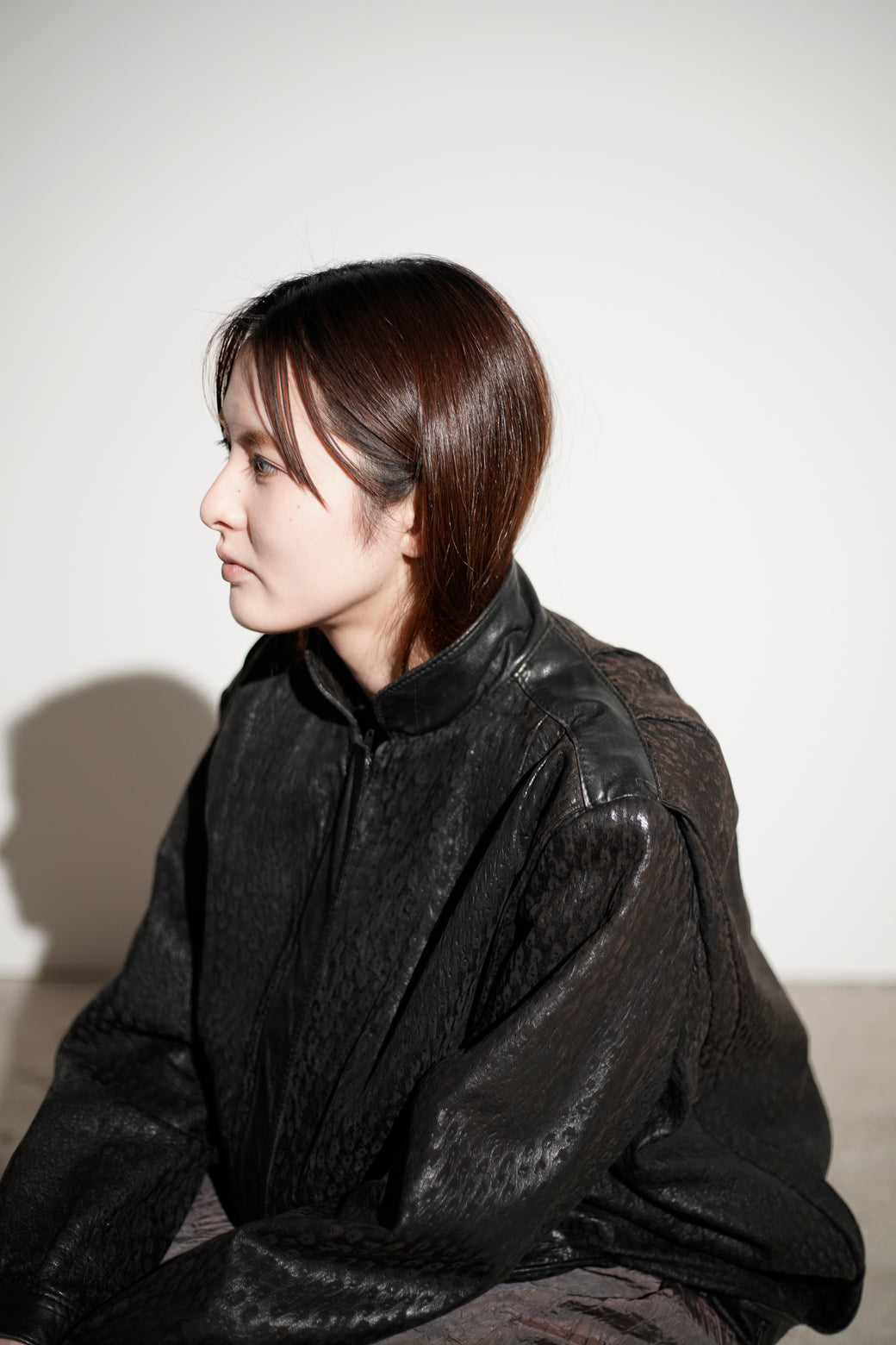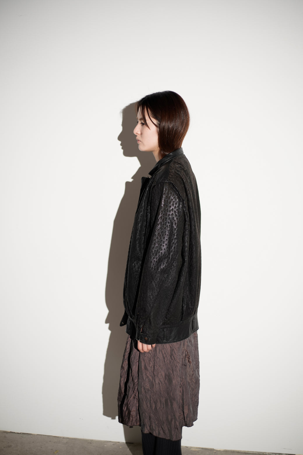 シボ感の強いレザーを使用したスタンドカラージャケット。フロントは比翼仕様で、ミニマルな構成。裾はややボックス寄りのシルエットで、身幅にゆとりがあります。襟はやや高さのある設計で、立ち上げても寝かせても着用可能。袖・裾まわりは切り替えが入り、レザー特有の重みと落ち感があります。経年による適切な風合いを伴った良好なコンディション。