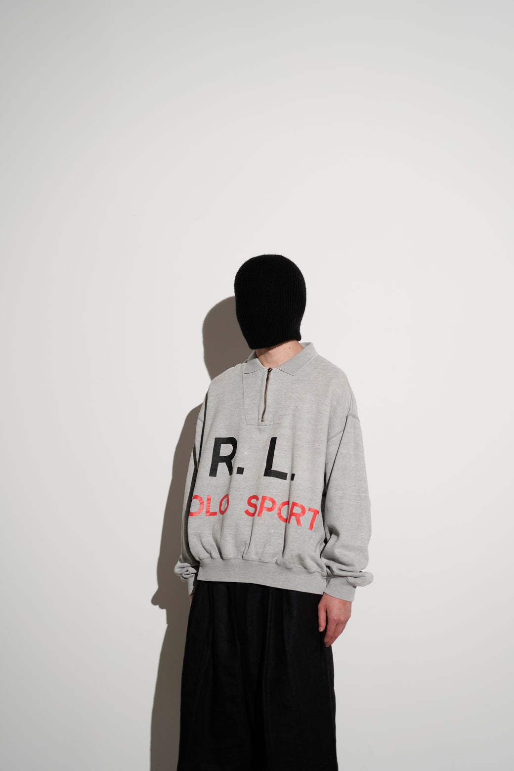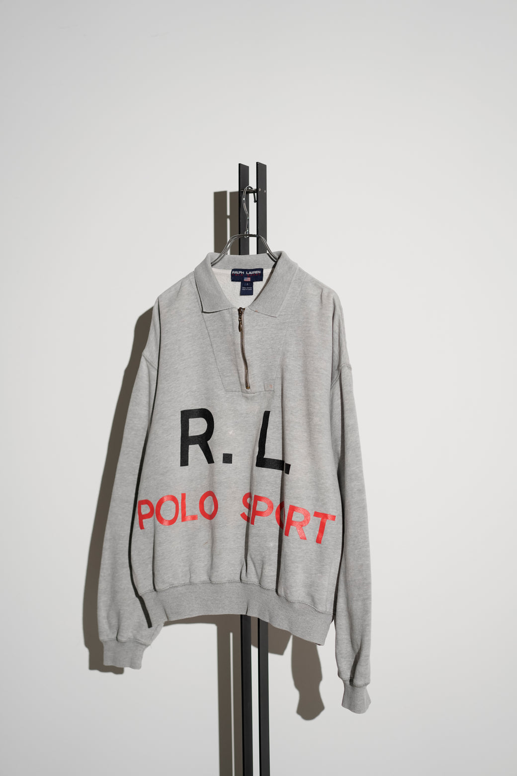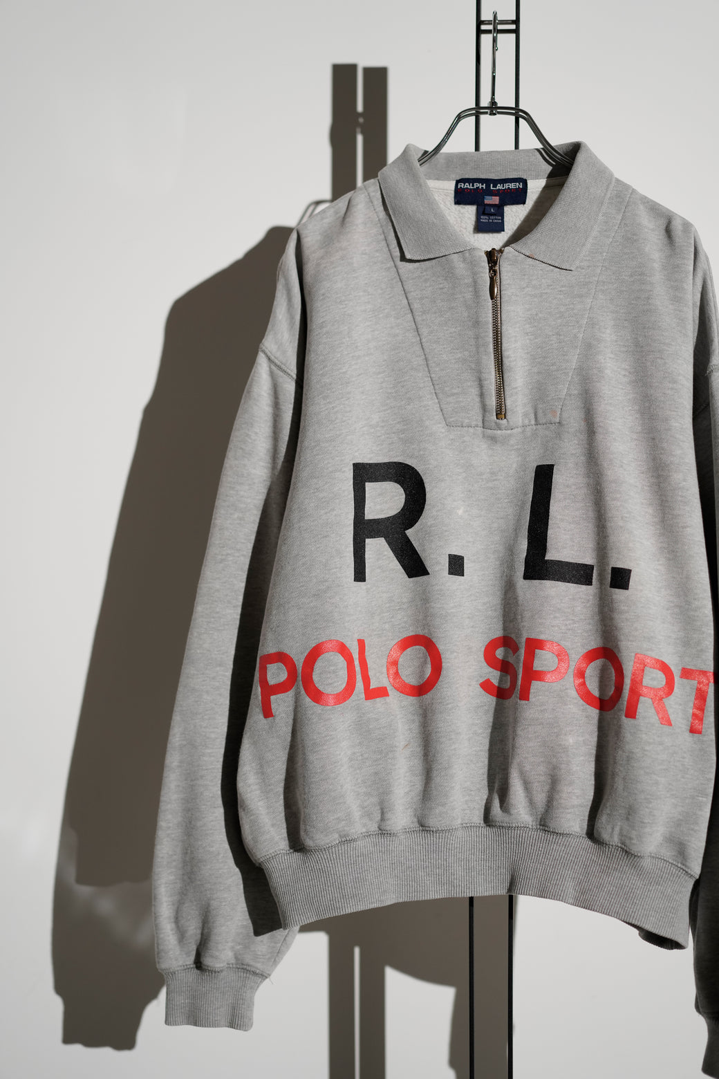 1990年代後期の"POLO SPORT"ハーフジップスウェット。 フロントに「R.L.」と「POLO SPORT」のグラフィックプリントを配置したデザイン。 ポロカラーとハーフジップ仕様、杢グレーのボディに裏起毛コットンスウェットを使用。胸部に小さなシミあり。大胆なグラフィックとカラーリングが良い希少なアーカイブ。経年による適切な風合いを伴った良好なコンディション。