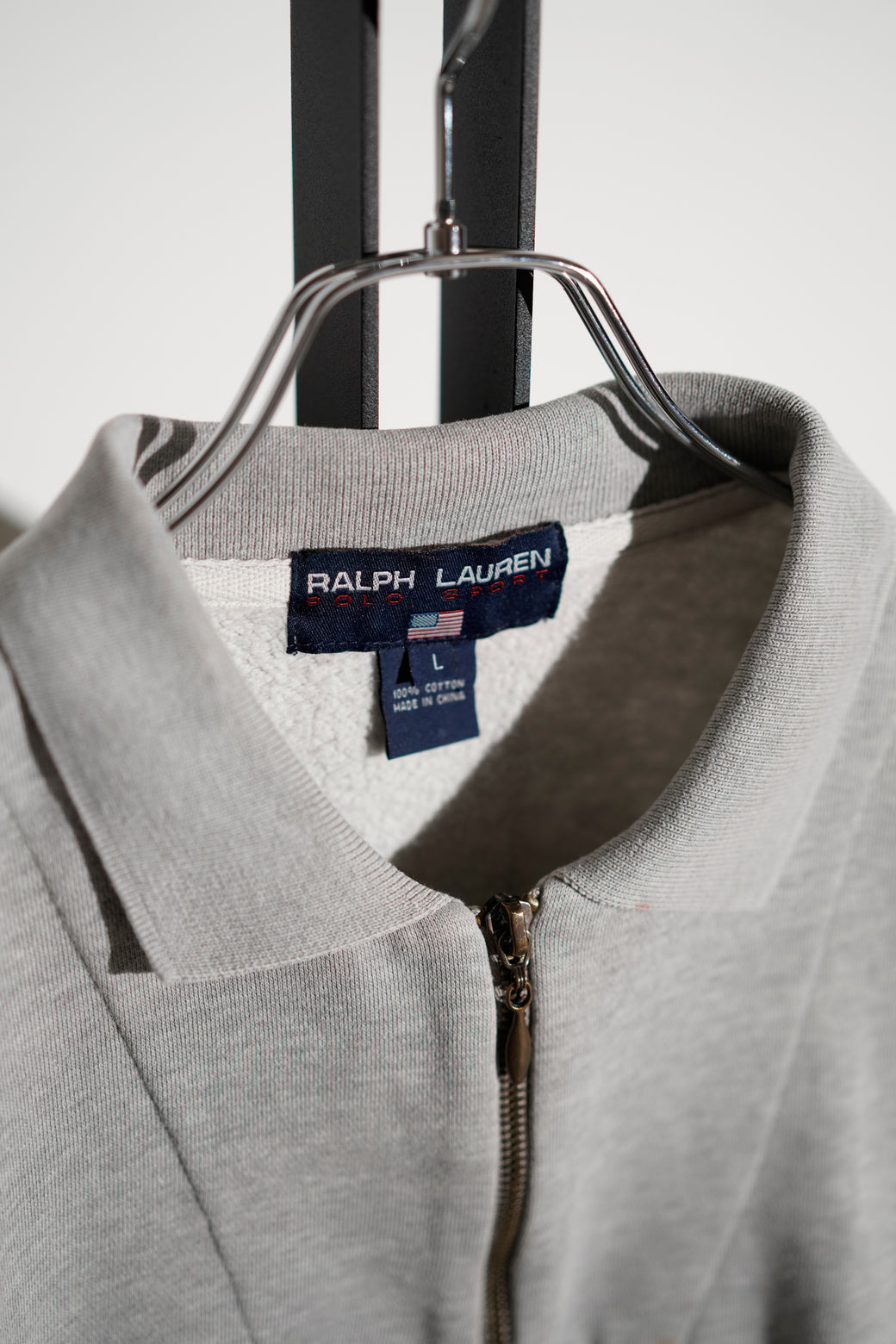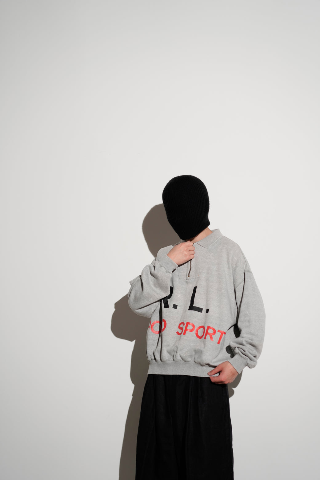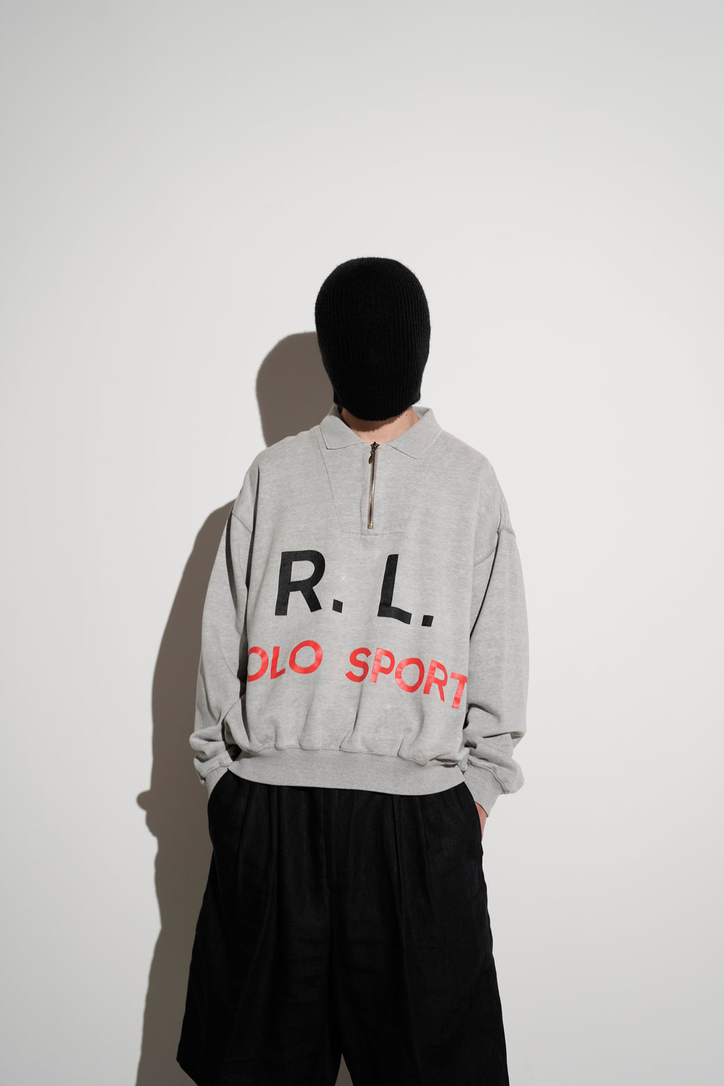 1990年代後期の"POLO SPORT"ハーフジップスウェット。 フロントに「R.L.」と「POLO SPORT」のグラフィックプリントを配置したデザイン。 ポロカラーとハーフジップ仕様、杢グレーのボディに裏起毛コットンスウェットを使用。胸部に小さなシミあり。大胆なグラフィックとカラーリングが良い希少なアーカイブ。経年による適切な風合いを伴った良好なコンディション。